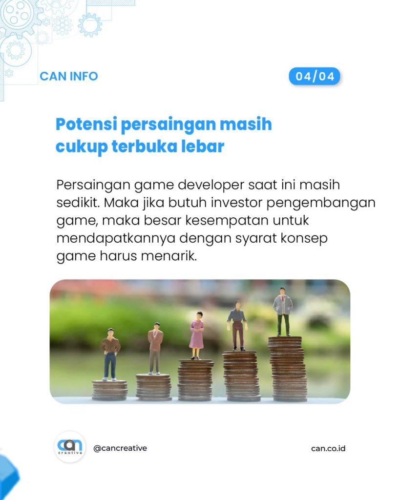 Jika ada banyak bisnis berada di satu tempat yang sama maka akan menimbulkan persaingan satu sama lain. Namun hal ini berbeda dengan game developer karena saat ini angkanya masih sedikit. Maka jika kita butuh penginvestasian dana pada pengembangan game, maka besar kesempatan kita untuk mendapatkan investor dengan garis bawah konsep game harus menarik.