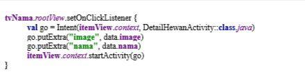 Lalu buka kembali kode di class HewanHolder dan tambahkan beberapa kode dibawah ini untuk pindah activity dengan Intent dengan membawa beberapa data dari item yang sudah dipilih .